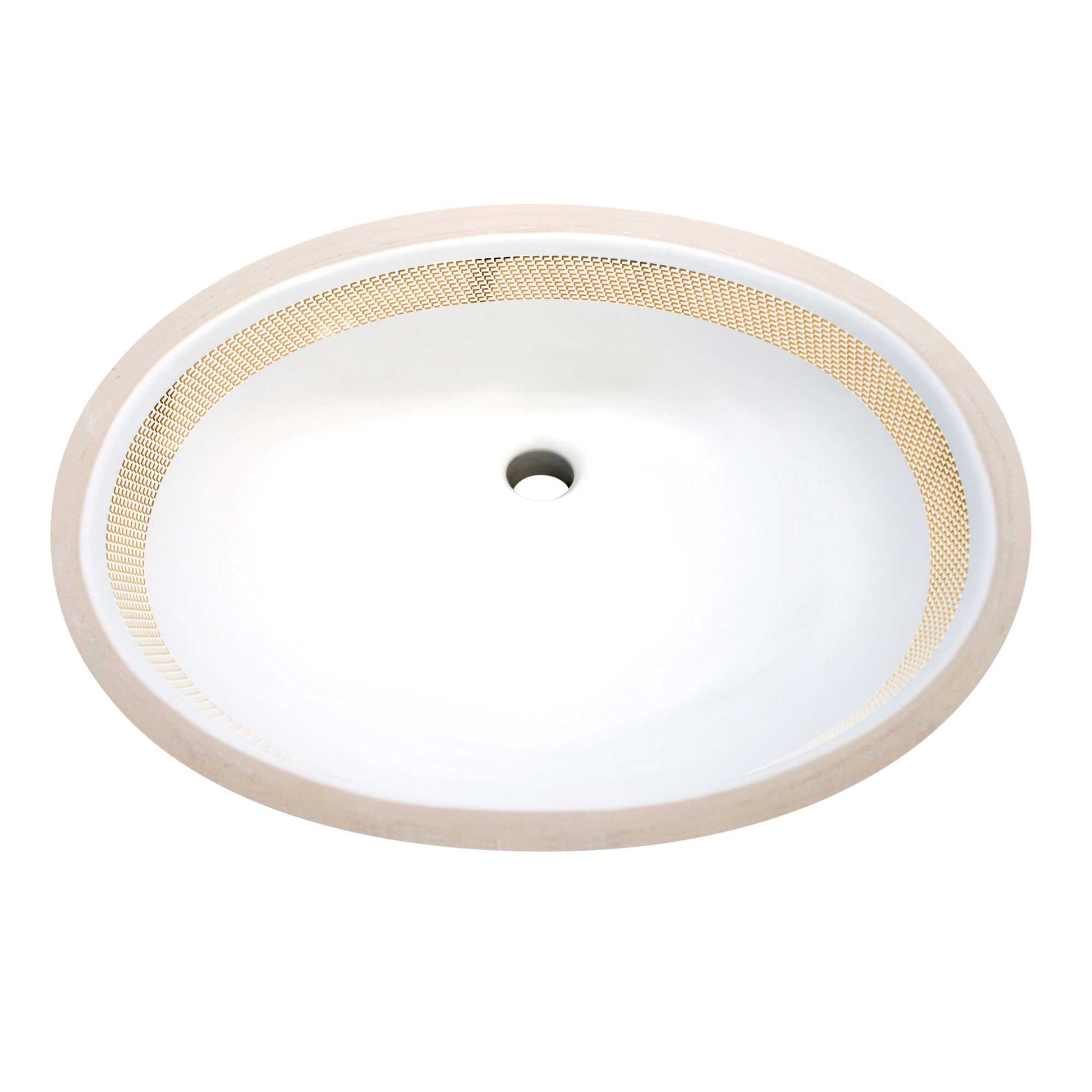 Platinum geometric border painted on this sink looks kind of like Chain Maille. Great in any bathroom decor... traditional, transitional or modern, contemporary, even a men's room. Most sinks are pretty flowery, this one isn't. Works great on an undermount sink in a vanity with any marble, quartz or granite counter. Available in real metallic gold or platinum.