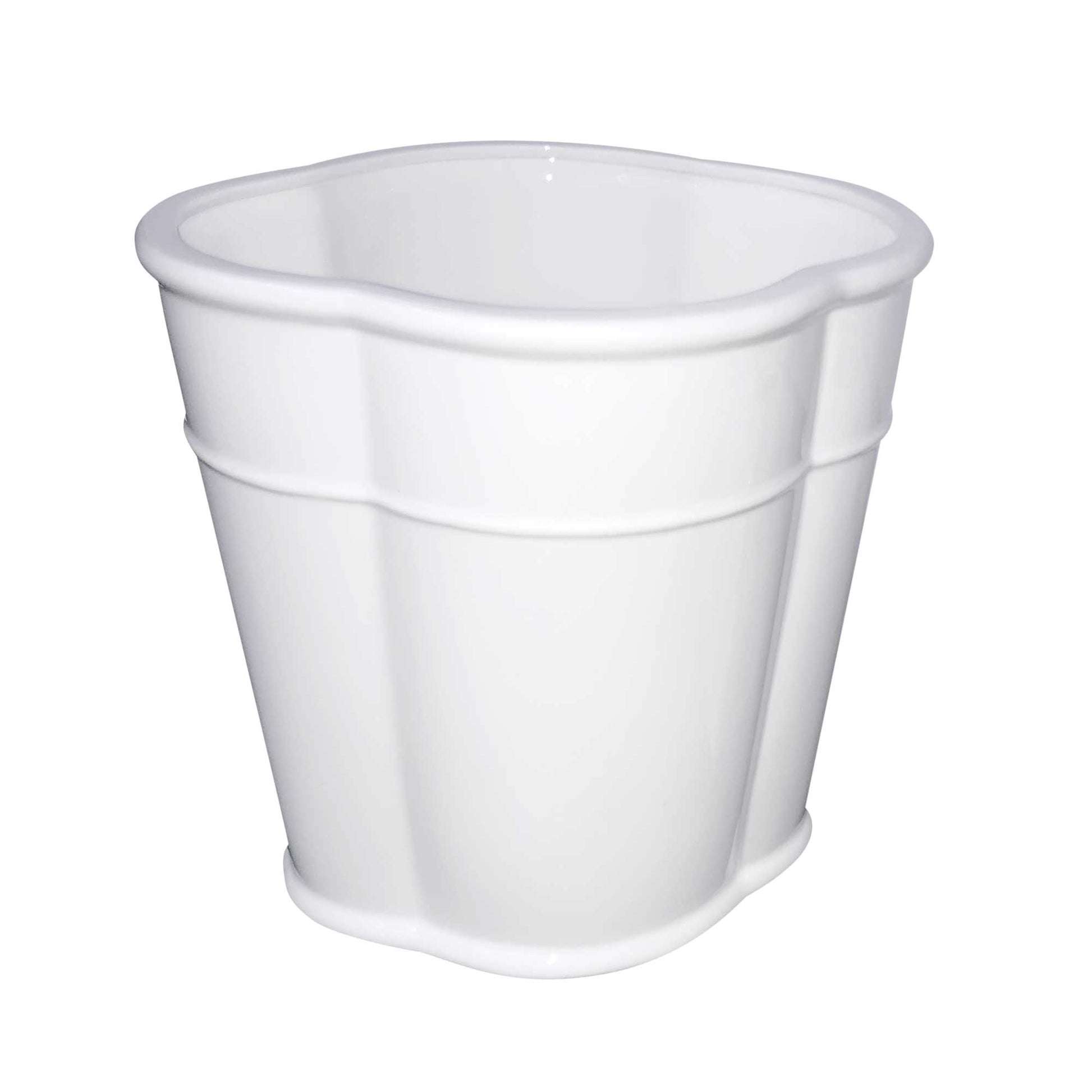 Ceramic wastebasket. Elegant shape and great for decoration. White or off-white, not a true biscuit but closer than white. 8" wide x 10" high.